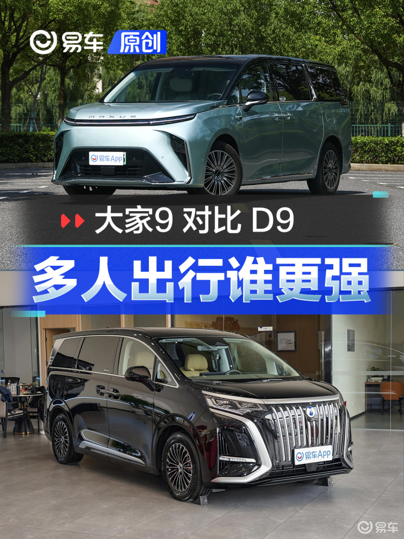 大家9的长宽高尺寸为5270x2000x1840mm,轴距为3200mm,D9的长宽高尺寸为5250x1960x1920mm,轴距为3110mm,无论是在直观感受还是客观数据上,D9看上去都要比大家9小一点。另外需要注意的一点是,市面上一些限高1.85m的地库,腾势D9是无法进入的,而大家9则没有这样的困扰。