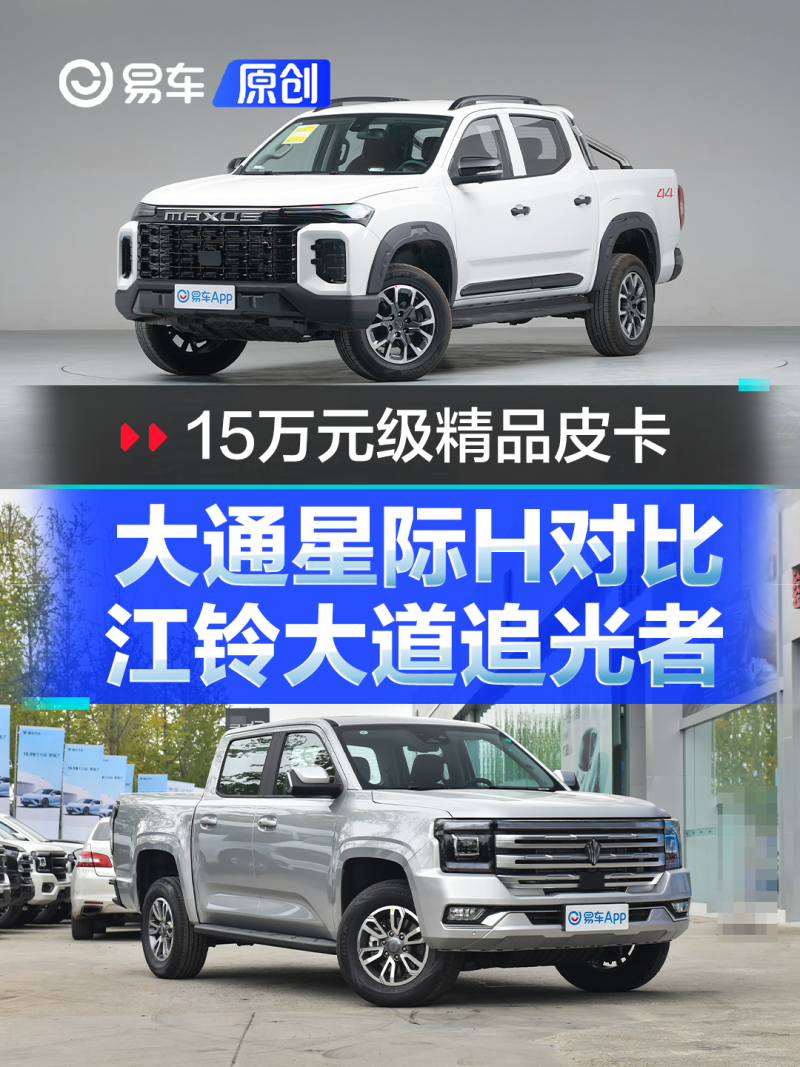 易车原创 近几年来,皮卡消费升级已经成为共识,主流皮卡品牌纷纷推出乘用化、高端化、智能化、网联化产品,在这一细分领域也诞生了不少精品皮卡。例如上汽大通MAXUS今年推出的 “星际皮卡”,其中星际H以其高定位和强烈的玩乐属性独树一帜。而有着 “亚洲第一控卫”之称的郭艾伦更是该系列皮卡代言人及首位车主,不仅颠覆了消费者对皮卡的固有印象,更是在乘用化皮卡领域竖起了新标杆。当然,在这个细分市场也还有其他实力不错的玩家,例如江铃大道追光者,在定位、价格以及诸多功能属性等方面都与星际H有重叠,这也让很多人纠结它们之间该如何选择呢,今天我们就来详细对比看看。