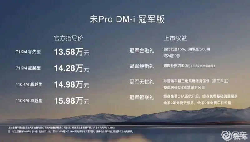 在上个月,宋Pro DM-i 冠军版已经完成了上市,售价13.58-15.98万元,短短一个月时间交付量就已经达到了1.5万辆,而这还是71km版本还未开启全面交付的情况下,新车最明显的变化就是价格降低了而且纯电续航也从51km起变为71km起,电机全系换为145kW,同时全系支持3.3kW的对外放电功能。